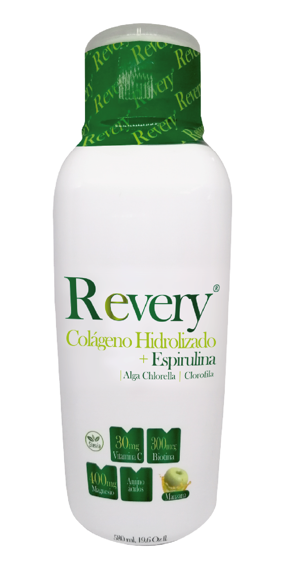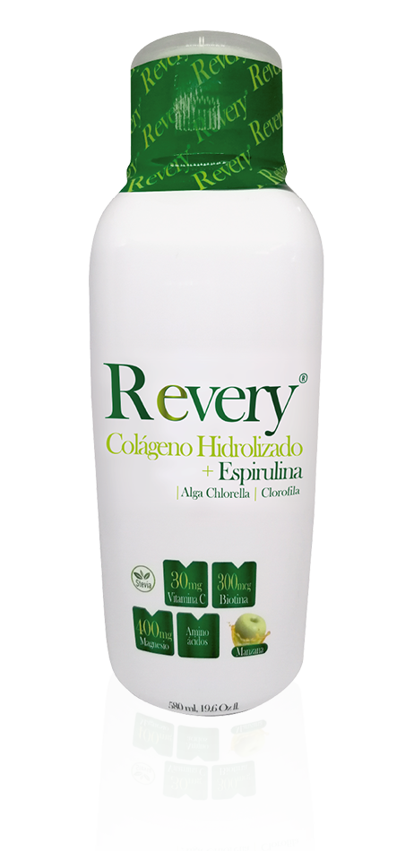 El colágeno hidrolizado es el complemento ideal para tu nutrición, ya que este ha sido procesado para romper las moléculas grandes en fragmentos, de tal manera que la absorción por el cuerpo sea la adecuada. Revery es una bebida elaborada con péptidos de colágeno e ingredientes especiales como espirulina, magnesio, biotina y clorofila; con adición de vitaminas y minerales, ingredientes que aportan extraordinarios beneficios para tu cuerpo, como: